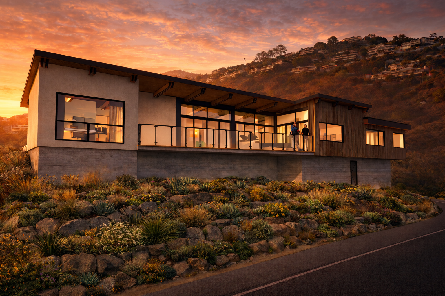 All renderings were developed directly from the working 3D model, enabling precise control over composition, lighting, and environmental conditions. Sunset scenarios were used to highlight material warmth, interior glow, and the relationship between the home and the surrounding coastline.